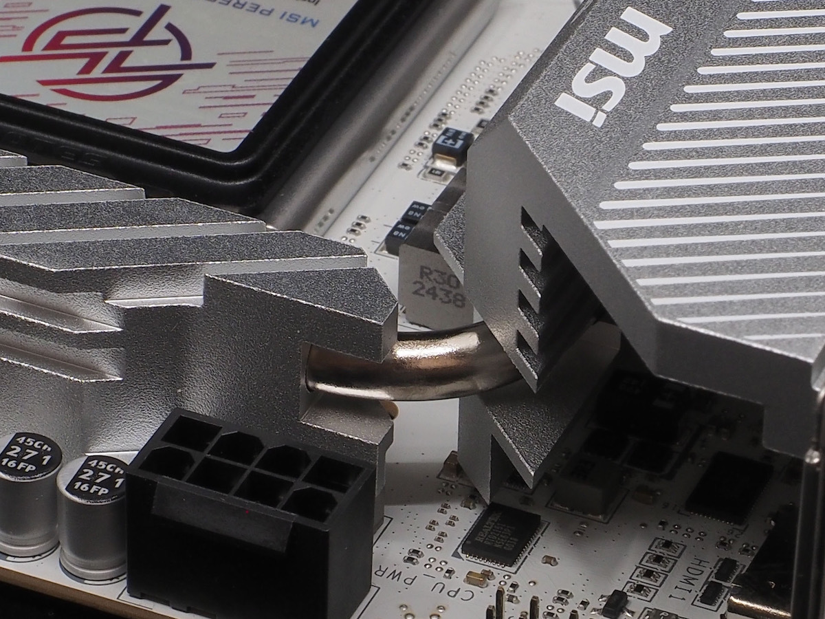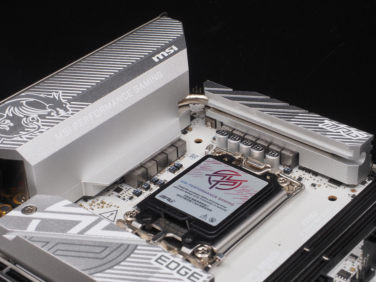 ヒートシンクに目を向けてみよう。まずCPUソケット左側にはI/Oシールド部分まで拡大した大型ヒートシンクを採用している。これはMSIマザーボードでは伝統的なスタイルだ。そしてCPUソケット上側にもブロック型ヒートシンクが搭載されている。なお、この2つのヒートシンクはヒートパイプで結ばれている。CPU Vcore用MOSFETがCPUソケットの上側中心に並ぶため、おそらくはより大型なCPUソケット左側のヒートシンクに対して熱輸送、熱分散して冷やす設計と思われる。ほか、MOSFET用サーマルペーストには7W/mk仕様のものが採用されているという。