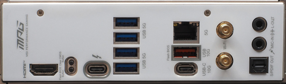 インターフェースでは、Thunderbolt 4、USB 3.2 Gen 2 Type-C×2、USB 3.2 Gen 2 Type-A、USB 3.2 Gen 1×6、USB 2.0×2、HDMI、5GbE、Wi-Fi 7、オーディオ入出力、S/PDIF。バックパネルにはクリアCMOSおよびFlash BIOSボタンを備える。なお、バックプレートもここに接続するWi-Fiアンテナもホワイトだ。