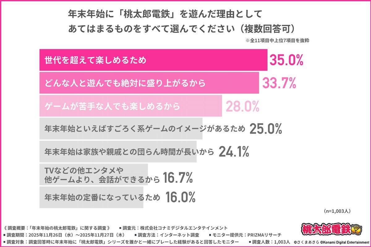 年末年始に「桃太郎電鉄」をプレイしたことがある全国1003名への調査から、家族同士の会話が生まれるゲーム設計であることと、幅広い世代で楽しんでいることがデータとしても確認されたという。
