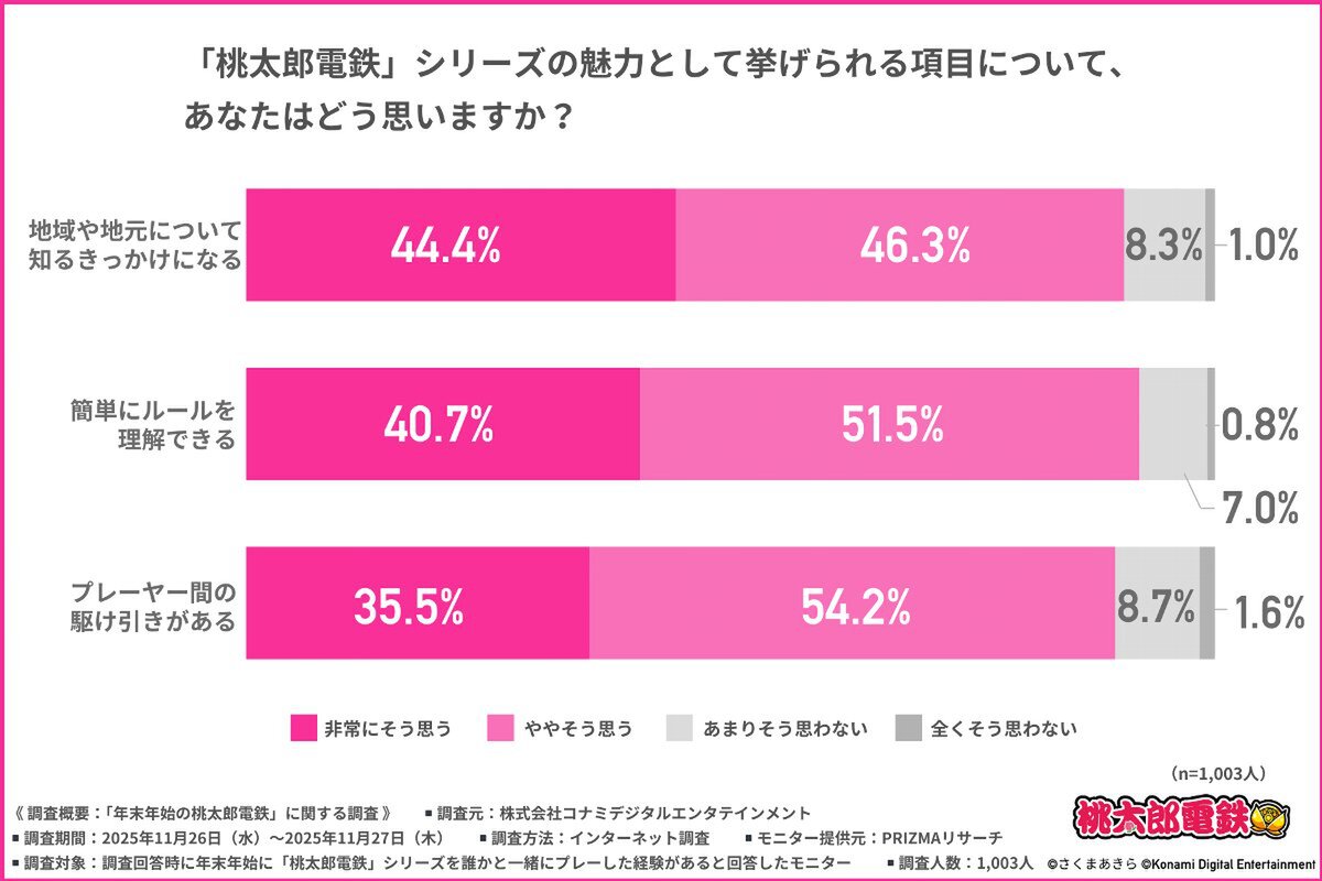 『「桃太郎電鉄」シリーズの魅力として挙げられる項目について、あなたはどう思うか』と尋ねたところ、「地域や地元について知るきっかけになる」「プレイヤー間の駆け引きがある」「簡単にルールを理解できる」などの項目で、9割以上が「非常にそう思う」「ややそう思う」と回答。