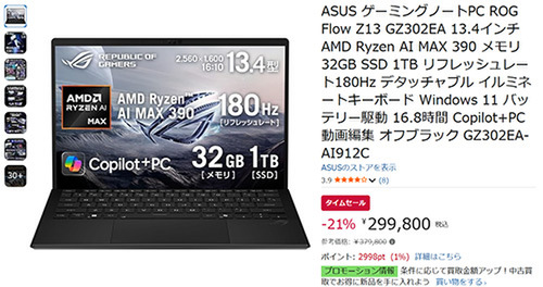 ASUSの注目ゲーミングPC「ROG Flow Z13 GZ302EA」が、Amazonタイムセールに登場しました。参考価格379,800円のところ、21%オフの299,800円で販売中です。