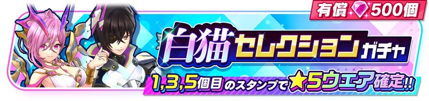 本ガチャは有償ジュエル500個限定で5回までまわすことができ、1回目、3回目、5回目のスタンプでは★5ウェアが確定となる。それぞれのキャラクターは限定ウェアも登場している。開催期間は、2026年1月5日15時59分(予定)まで。