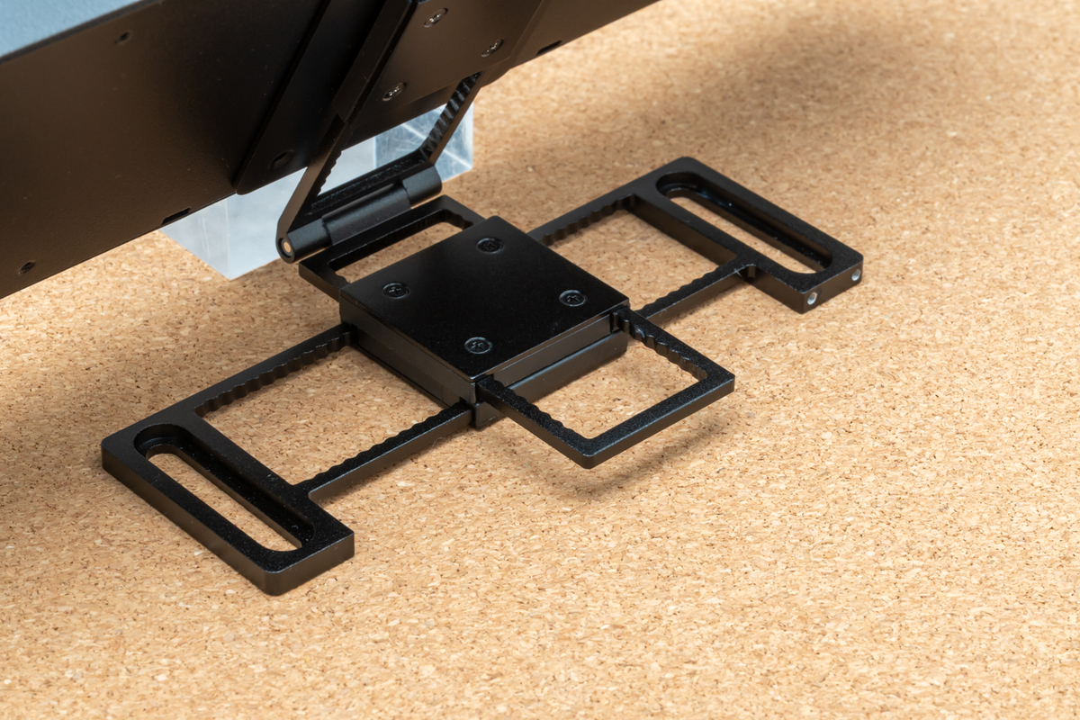 ブラケットは、ディスプレーの中央と左右の3ヵ所に取り付けできる。ブラケットのスライドレールと合わせて、ディスプレーを付ける位置の自由度は高くなっている。なお、ここの固定用ネジは小さいうえ、締めづらいので、なくさないように注意したい。