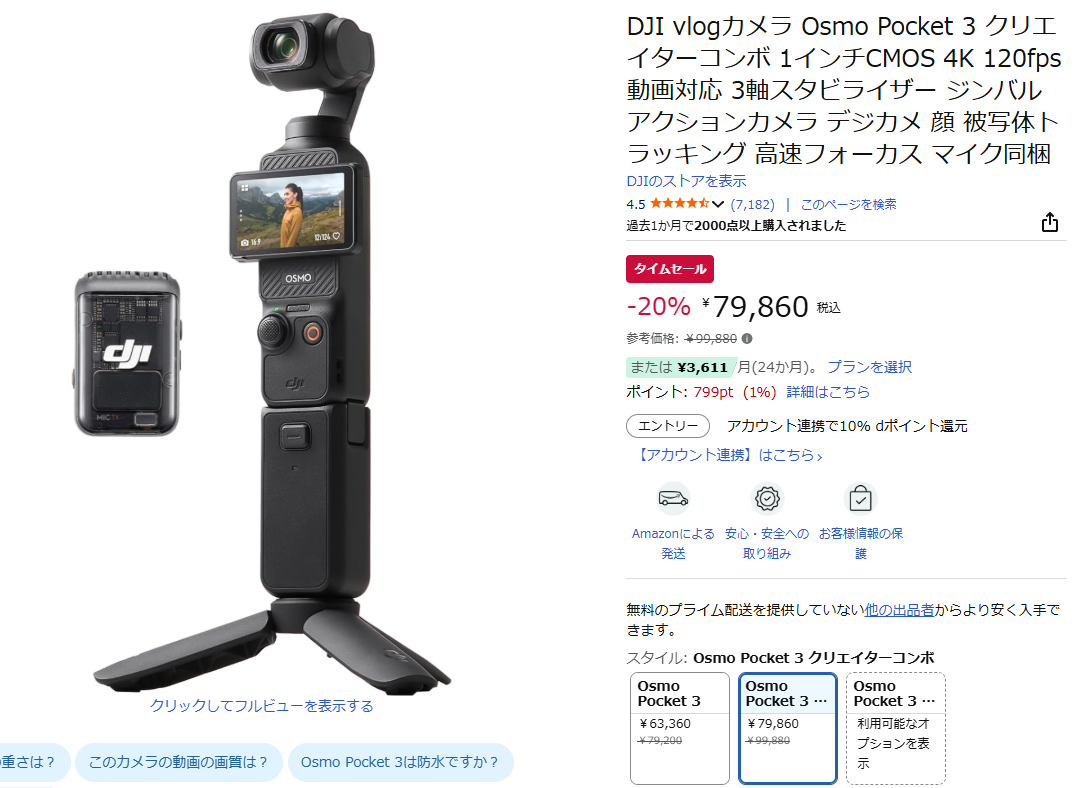 「Osmo Pocket 3クリエイターコンボ」の参考価格は99,880円ですが、セールでは20%オフの79,860円という割引価格で手に入ります。