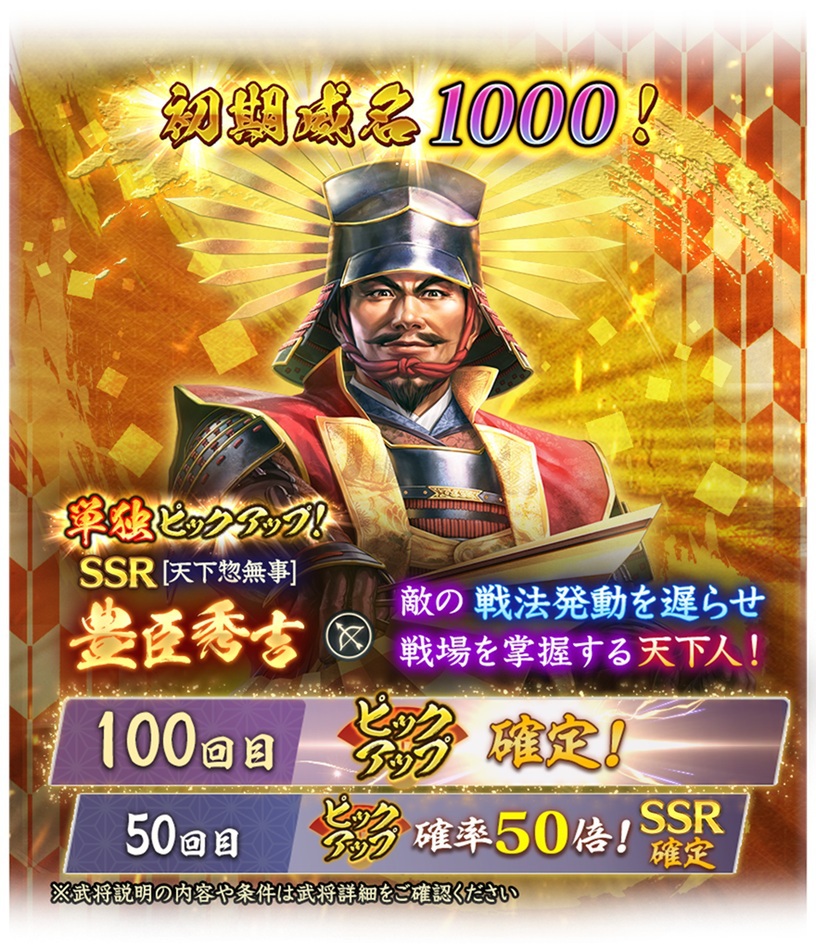 ■初期威名1000のSSR【天下惣無事(てんかそうぶじ)】豊臣秀吉がピックアップされる「将星特別登用・豊臣秀吉 ’26正月」開催!