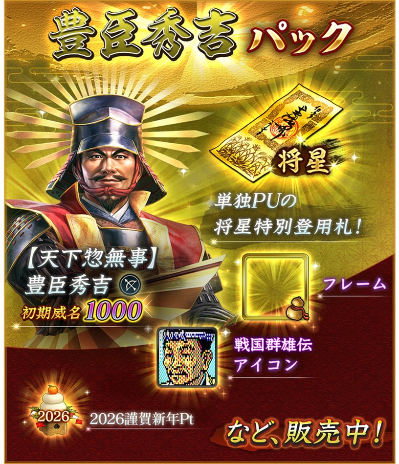 【天下惣無事】豊臣秀吉(初期威名1000)がピックアップされる「将星特別登用・豊臣秀吉 ‘26正月」を開催。開催期間は、2026年1月15日12時59分まで。