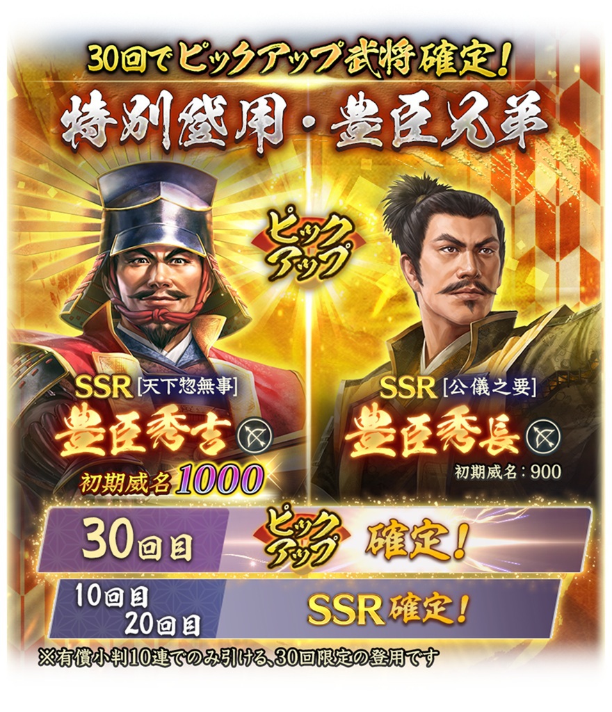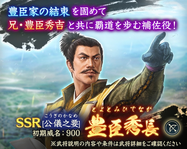 初期威名1000のSSR【天下惣無事】豊臣秀吉と初期威名900の【公儀之要】豊臣秀長が登場する登用も開催中!