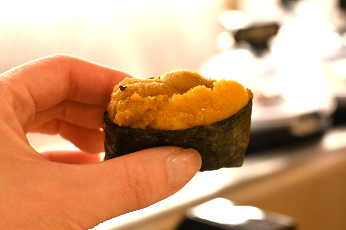 ひと口食べると、磯の香りがふわっと口いっぱいに広がります。後味は意外にもすっきりとしていて、くどさはありません。「これが1貫400円の味!!」と、思わず感動。想像以上に上品な味わいで、このおいしさなら2貫、3貫と手が伸びそうです。「400円だけど、おかわりいっちゃう!?」と自問してしまう……。
