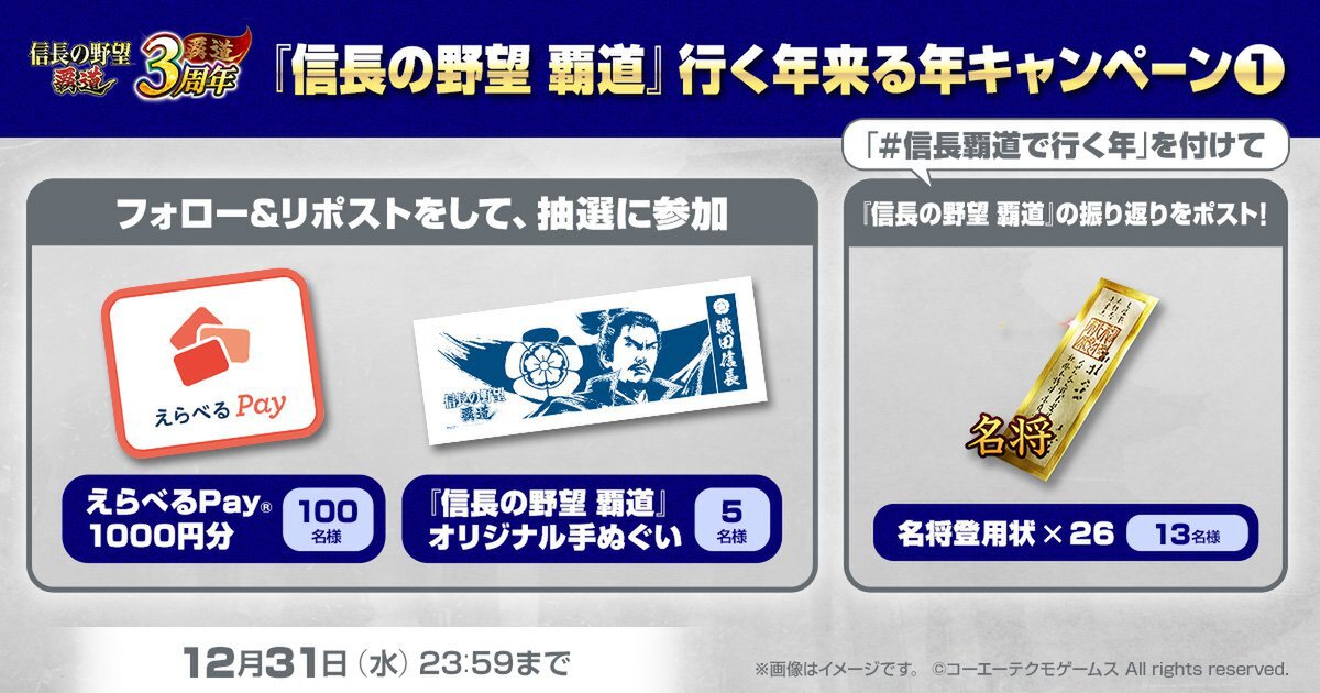 ②「えらべるPay」1000円分または『信長の野望 覇道』手ぬぐいが当たるフォロー&リポストキャンペーン