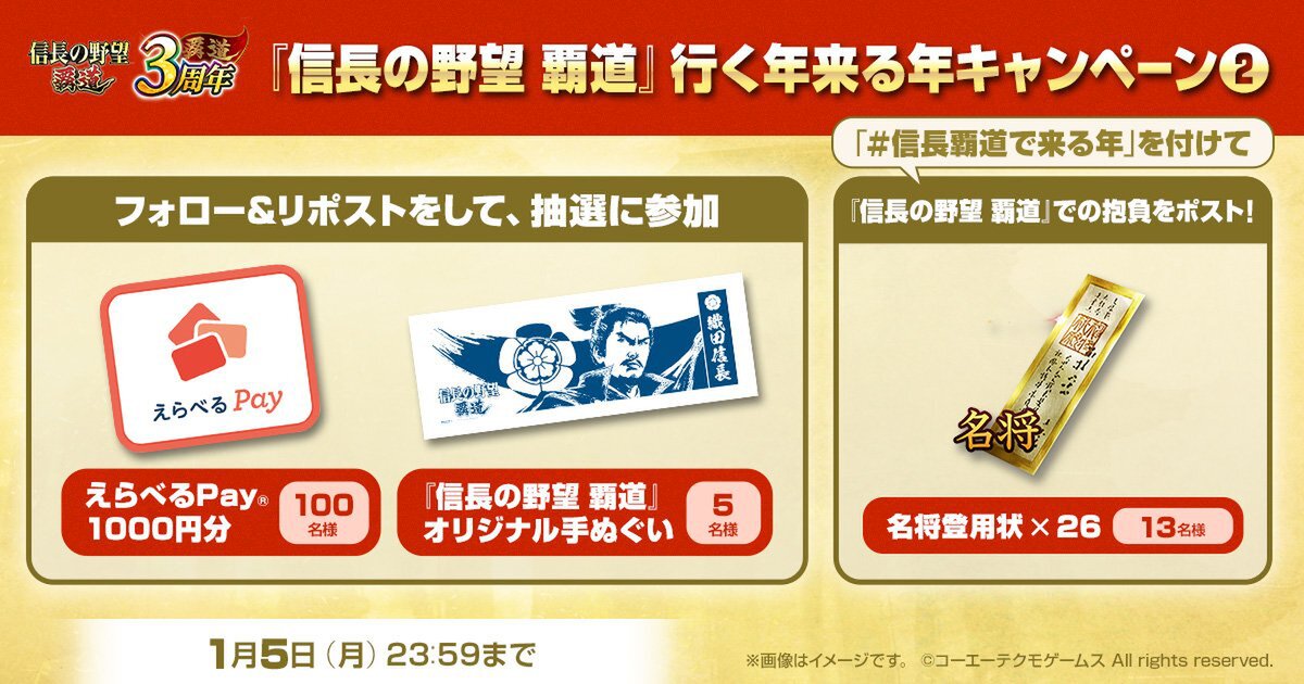 ・コーエーテクモゲームス(以下「当社」といいます)は「『信長の野望 覇道』行く年来る年キャンペーン」(以下「本キャンペーン」といいます)に関して、以下の応募規約を定めます。