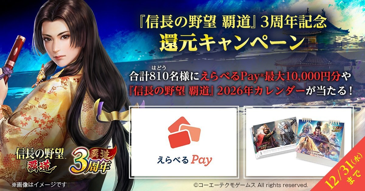 なお、ゲーム内では、ミッションを達成することでラインアップの中から好きな商品と交換できる「えらべるPay」や、“『信長の野望 覇道』2026年カレンダー”などの賞品が後日当たる「3周年記念還元キャンペーン」を、2025年12月31日まで開催中。