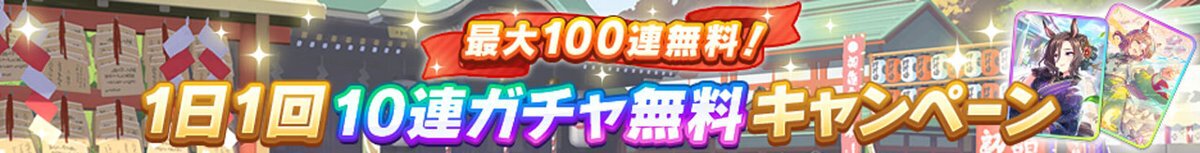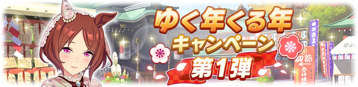 「ゆく年くる年キャンペーン」では、「ピックアップ サポートカードガチャ」を対象とした「1日1回10連ガチャ無料キャンペーン」や最大5100個のジュエルを獲得できる2種類のログインボーナスを実施している。ほかにも育成報酬が増量する「おみくじキャンペーン」や育成中のレースでピースが獲得できる「新春レース応援キャンペーン」などキャンペーンが盛りだくさんだ。