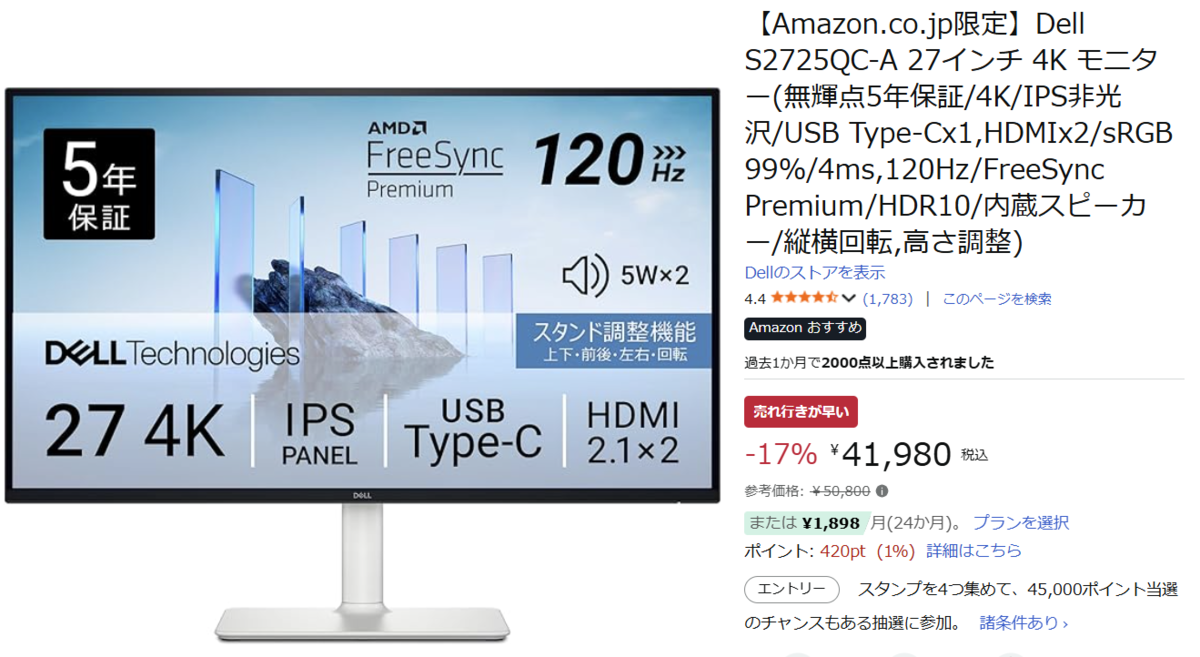 4K解像度、120Hz高速表示、さらにUSB Type-C接続による65W給電機能を搭載。仕事もゲームも最高画質で楽しめる、Dell(デル)のAmazon.co.jp限定4Kモニター「S2725QC-A」(27インチ)が、Amazonでセール中。参考価格50,800円のところ、17%オフの41,980円という4万円台の価格で手に入ります。