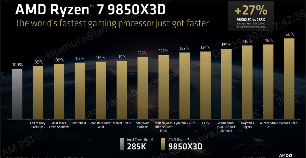 なお、基調講演では言及されなかったが、同時刻にAMDからデスクトップ向けプロセッサーの「Ryzen 7 9850X3D」が発表されている。35以上のゲームタイトルで、1080p・高設定時にCore Ultra 9 285K比で平均27%高速という結果を示し、「世界最速のゲーミングプロセッサー」をさらに更新したとする。
