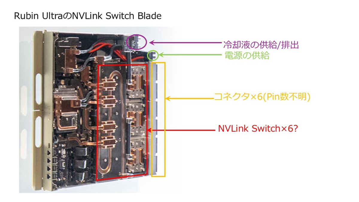 NVL576は名前の通り576個のRubinのダイが搭載されているので、ブレードあたり8ダイという計算になる。Rubin Ultraは1チップで4ダイ。すなわちRubin Ultraが2チップで、これにVeraが追加されて1枚のブレードという可能性が高い。COMPUTEX TAIPEIの取材で中山智氏が撮影した写真を拡大して注釈をつけたのが下図である。