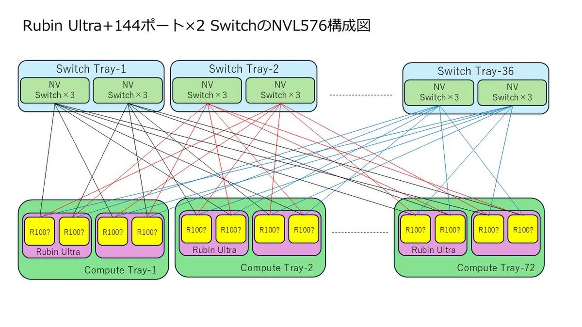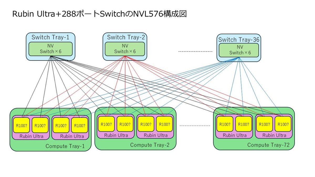 そもそもRubin世代までのNVLink Switchは72ポートだった。GPUの数が72個なので、これと辻褄があっている。ところがRubin Ultra世代ではGPUの数が144個になる。内部的には2GPU構成なのでGPUの数としては288個相当になる。これはポート数が絶対的に足りないわけで、すべてのGPU同士を1 Hop(GPU-NVLink Switch-GPU)でつなぐのがこの時点で無理という計算になる。したがって、NVLink Switchを複数介してPeer-to-Peerではなく2 Hopで接続する形態が考えられる。