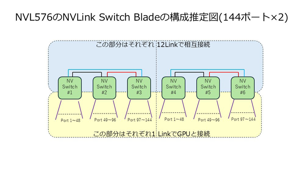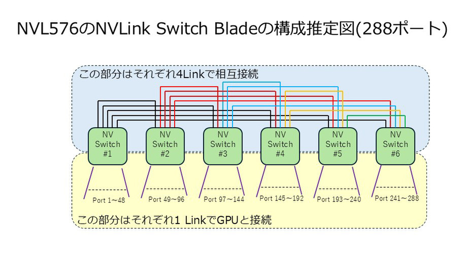 どちらも72ポートの72ポートのNVLink Switchのうち48ポートはRubin Ultraと接続、残り24ポートをほかのスイッチとの相互接続に利用する形となる。288ポートの場合、NVLink Switch Blade1枚あたりの帯域は68×6×100GB/秒=40.8TB/秒。144ポートの場合は72×3×2×100GB/秒=43.2TB/秒となる。前者なら36枚搭載すると1468.8TB/秒、後者なら1555.2TB/秒になり、どちらも丸めると1.5PB/秒という計算になる。