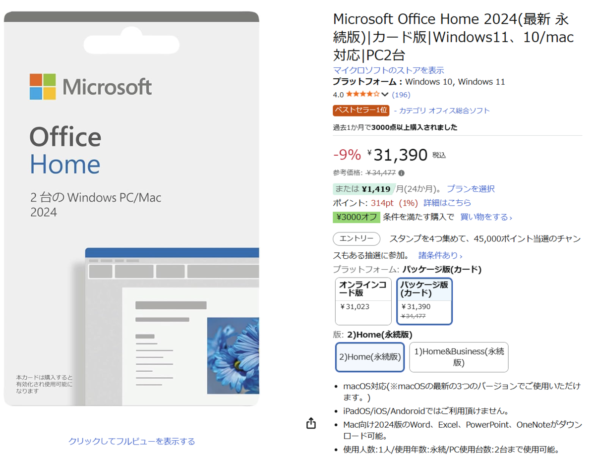 Microsoft Office Home 2024(永続版)カード版が、Amazon.co.jpでセール中です。参考価格34,477円のところ、9%オフの31,390円で購入可能です。