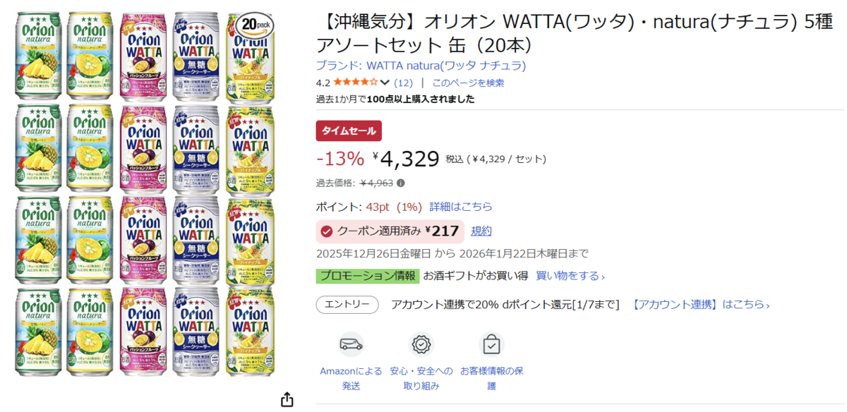 年末年始は家でのんびり“飲み比べ”が楽しい季節。沖縄フレーバーで気分を変えたい人に向けて、オリオンのチューハイ「WATTA」と、果汁感を売りにする「natura」をまとめて楽しめる20本セットをピックアップしました。タイムセールに加えてクーポンも出ているので、ストック用にもギフト用にもチェックしやすいタイミングです。
