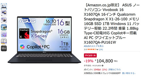 ASUSの16インチノートPC「Vivobook 16 X1607QA」が、Amazonタイムセールに登場しました。参考価格129,800円のところ、19%オフの104,800円で販売中です。