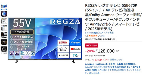 REGZA(レグザ)の2025年モデル、55インチ4K液晶テレビ「55E670R」が、Amazonタイムセールに登場しました。参考価格160,000円のところ、20%オフの128,000円で販売中です。