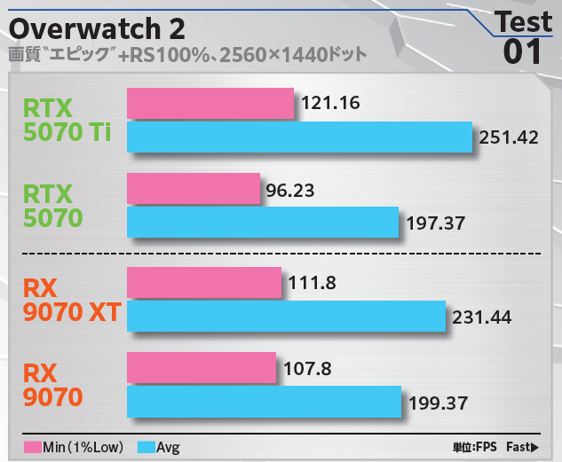 eスポーツタイトルである「Overwatch 2」では、安定した高フレームレートが必要。WQHD解像度の高画質設定でもフレームレートは十分で、コスパを考えれば、特にRadeonは優秀な結果と言える。