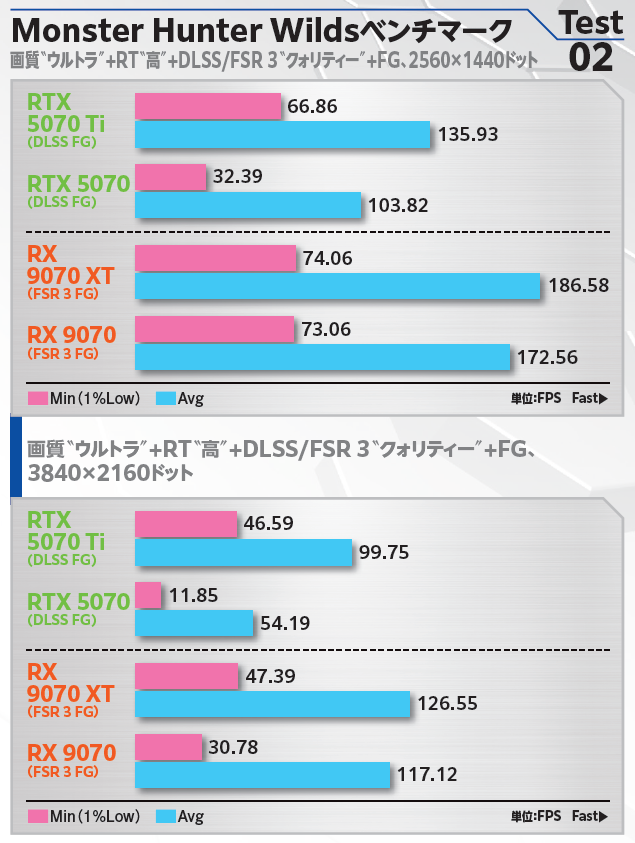 「Monster Hunter Wilds」の公式ベンチマーク。フレーム生成を使用している。GeForceがあまりパフォーマンスを発揮できておらず、特に唯一VRAMが12GBのRTX 5070では、高解像度で大きく落ち込む場面も。