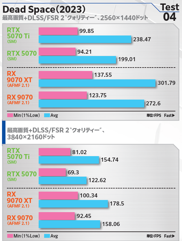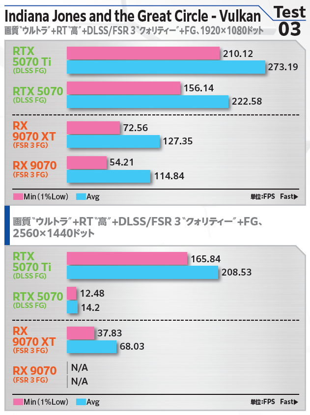 重量級タイトルである本作では、レイトレーシングを有効にしているため、GeForceのパフォーマンスが高い。Radeonはレイトレーシングではやや弱めだ。WQHDになると、RTX 5070もVRAM不足ゆえか動作困難に。
