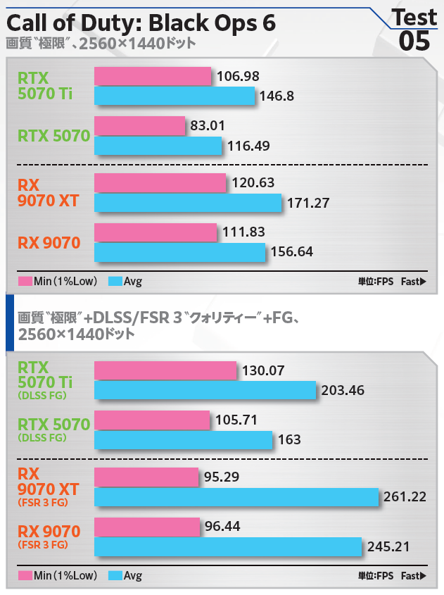 「Call of Duty: Black Ops 6」の場合、フレーム生成を有効化した際に、Radeonではフレームレートが大きく上がるが振れ幅が大きくなった。一方GeForceでは、安定してフレームレートの向上が見られる。