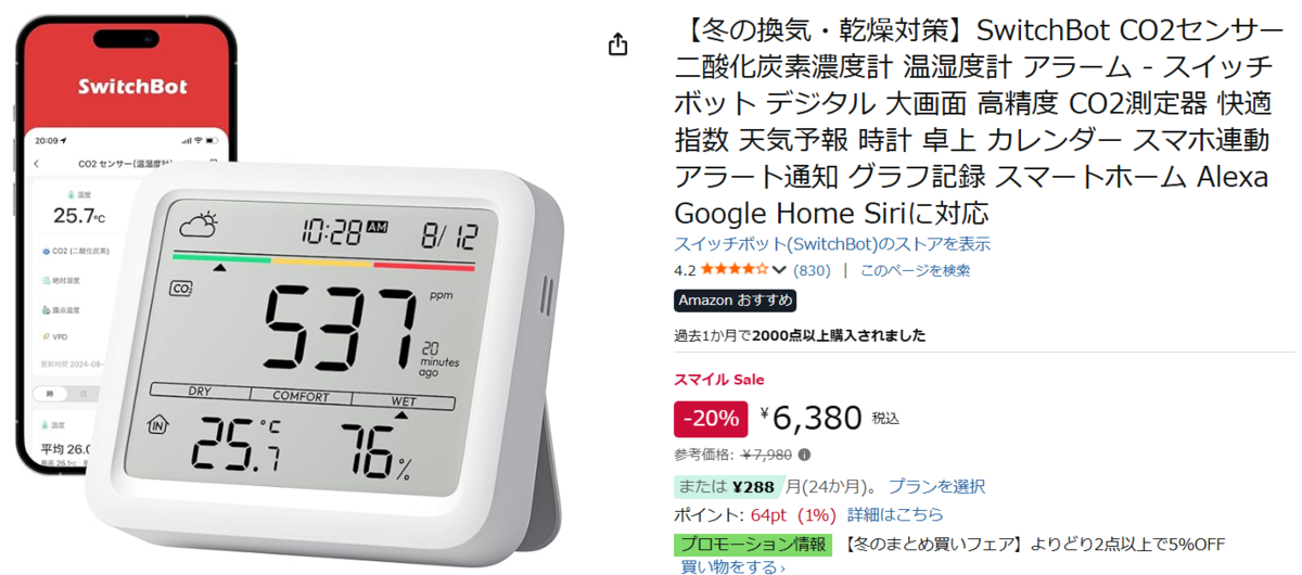 冬の乾燥やウイルス対策で「換気」のタイミングに悩む方へ。SwitchBot(スイッチボット)のCO2センサー(二酸化炭素濃度計+温湿度計)が、1月3日に始まったAmazonスマイルSALE 初売りに登場中です。