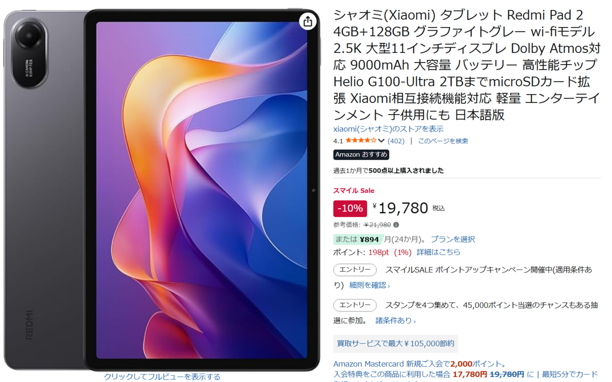 Xiaomi(シャオミ)の11型タブレット「Redmi Pad 2(WiFiモデル/4GB+128GB)」が、AmazonスマイルSALE 初売りに登場しました。参考価格21,980円のところ、10%オフの19,780円で販売されています。