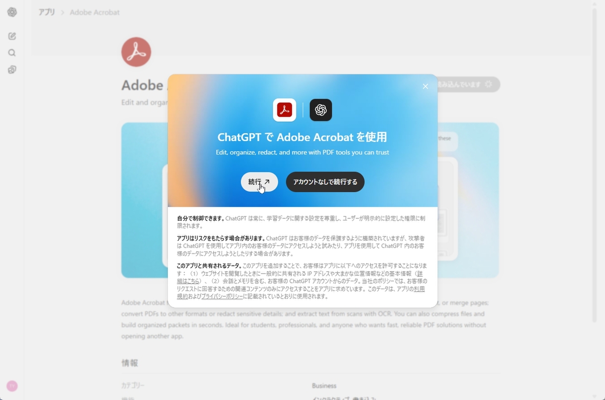 ChatGPTとAcrobatを接続する際、「実行」をクリックするとAdobeアカウントのログイン画面が開く。「アカウントなしで続行する」をクリックしても接続できるが、どちらにせよ高度なAcrobatの機能を利用するとAdobeアカウントでのログインを求められる。無料アカウントでもいいから、Adobeアカウントで接続しよう。