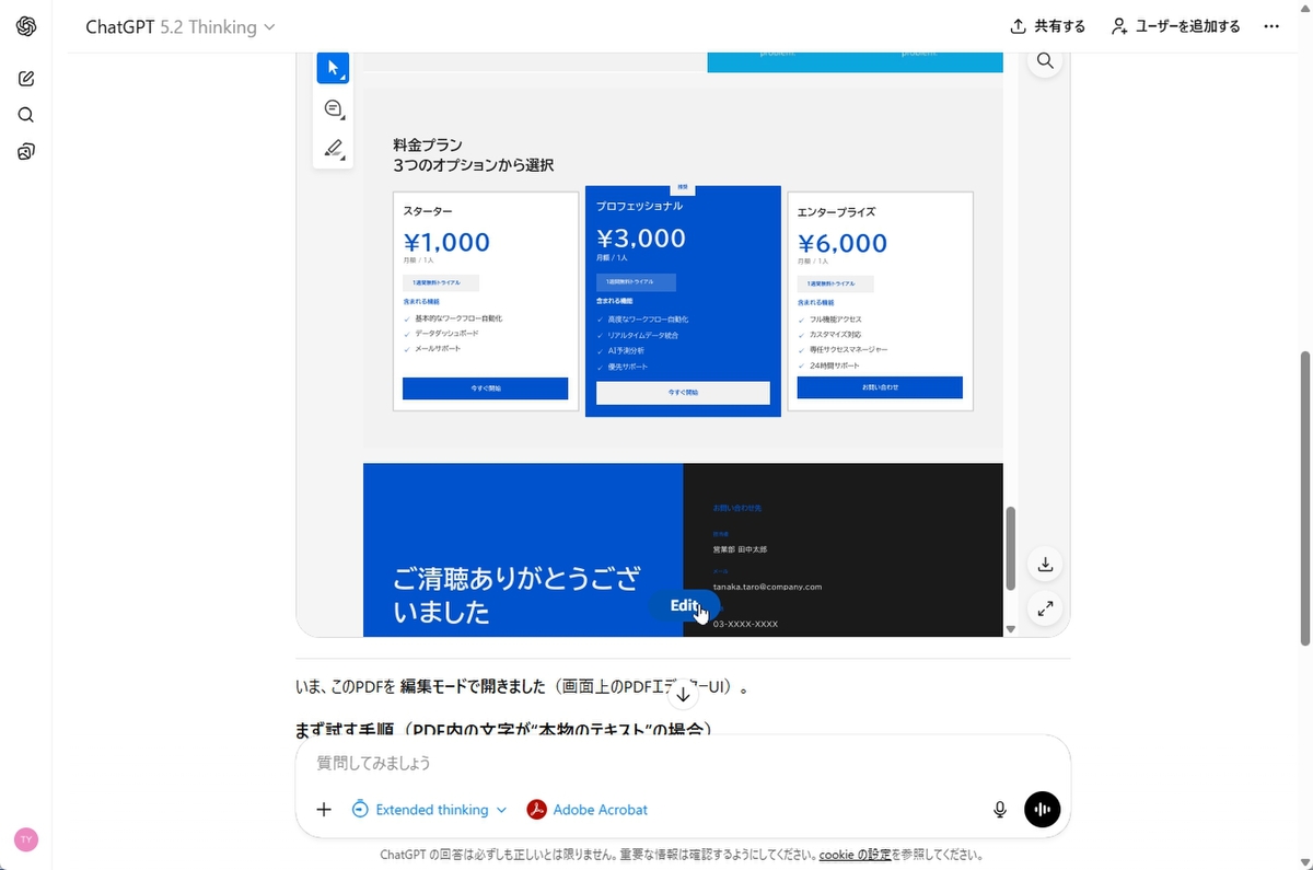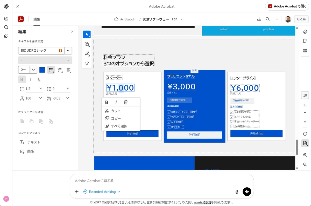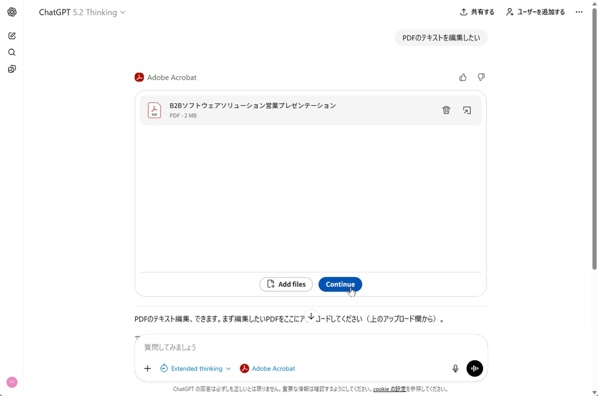 まずは、Acrobatのキラー機能である、PDFの編集を行ってみよう。「+」メニューから「Adobe Acrobat」を選択し、「PDFのテキストを編集したい」と入力する。すると、ファイルの登録画面が開くので、ドラッグ&ドロップしてPDFをアップロード。「continue」や「Edit」をクリックし、編集画面を開こう。