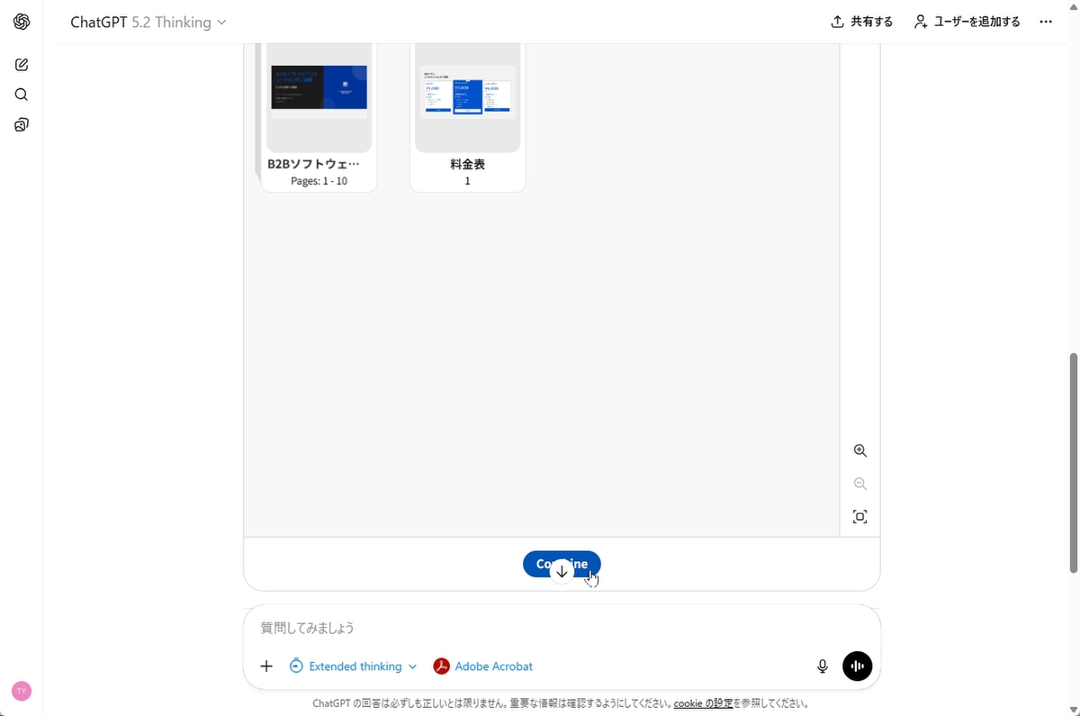 今度は複数ファイルを統合させてみよう。ここでは、営業資料に料金表を追加してみる。まずは、Acrobatモードにして、「複数のPDFを統合させたい」と入力する。複数ファイルをドラッグ&ドロップしてアップロードしたら、確認画面で「continue」をクリックすればいい。