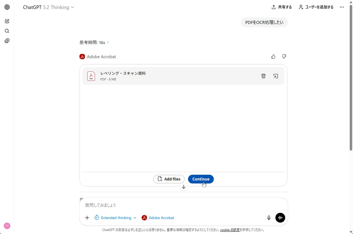 紙資料をスキャンしたPDFをアップロードし、OCR処理させることもできる。プロンプトは「OCR処理したい」でいい。