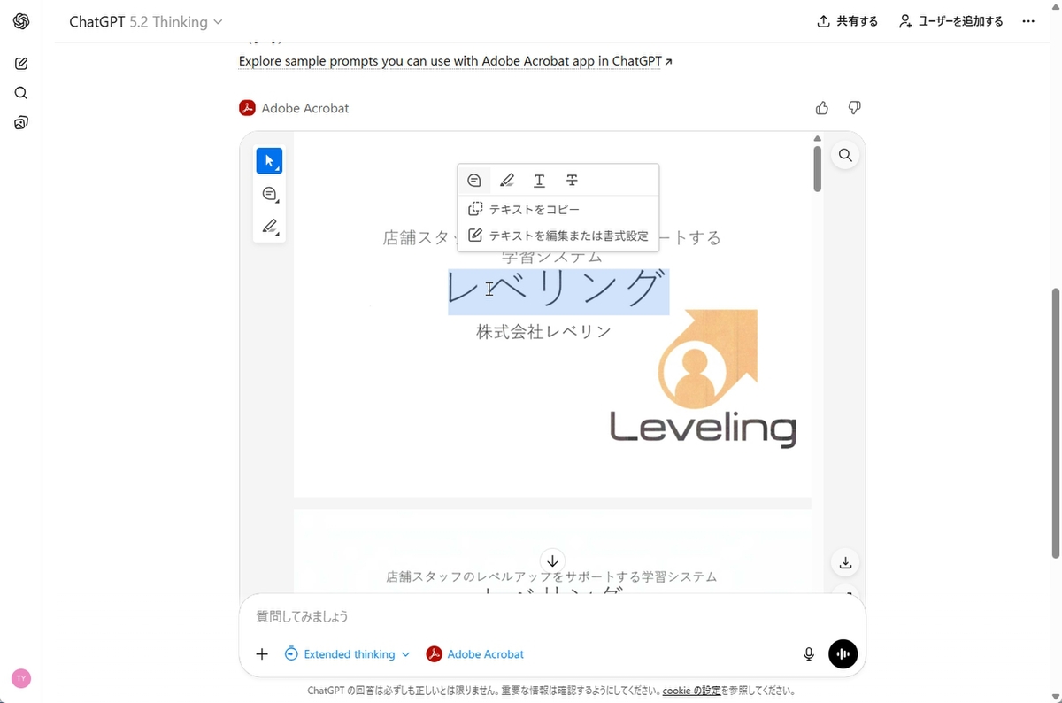 Adobeのウェブサイトに推奨プロンプトが公開されている。とは言え、PDFの要点をまとめたり、インサイトを出させるといったことは、もとよりChatGPTでできるので割愛する。