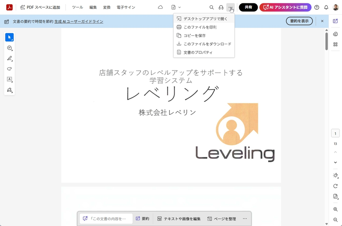 Acrobatの機能で処理後のファイルはChatGPT上からダウンロードできることもあるし、Acrobatウェブ版へのリンクになっていることもある。もちろん、Acrobatウェブ版でも「…」メニューから「このファイルをダウンロード」をクリックすればダウンロードできる。