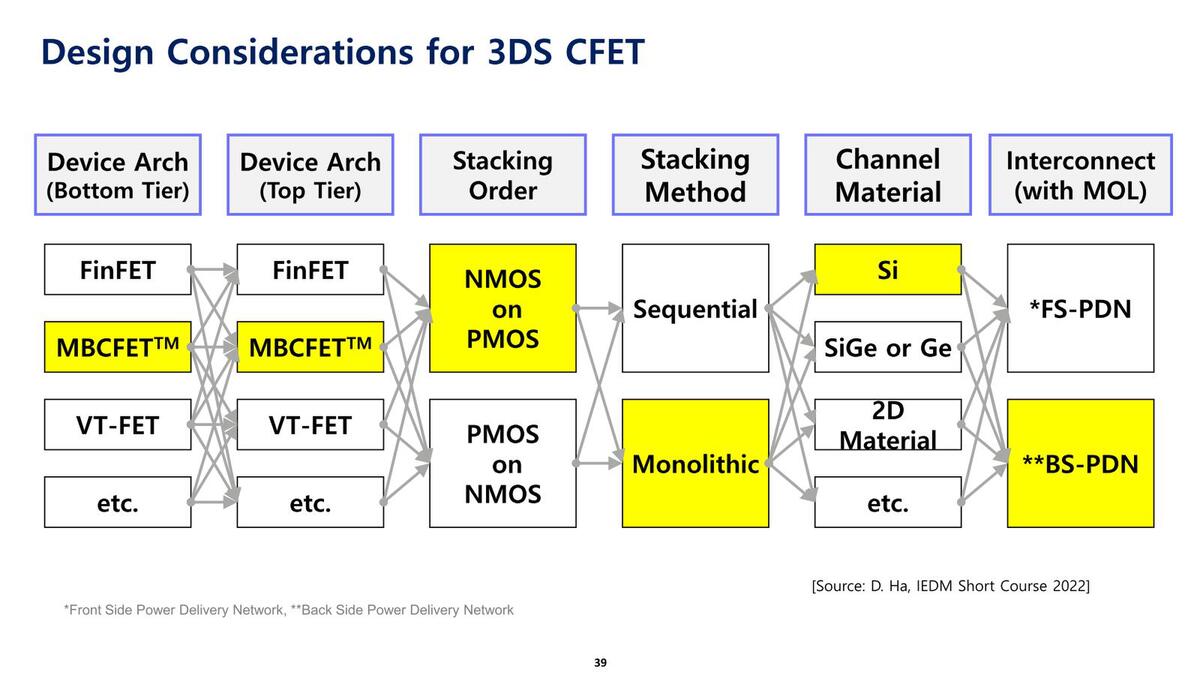 この際の選択肢として、上と下のFETになにを使うか、PMOSとNMOSのどちらを上にするか、どう積むか、チャネル材料をどうするか、電源をどこから供給するかなどの多数の選択肢があるのがわかる。