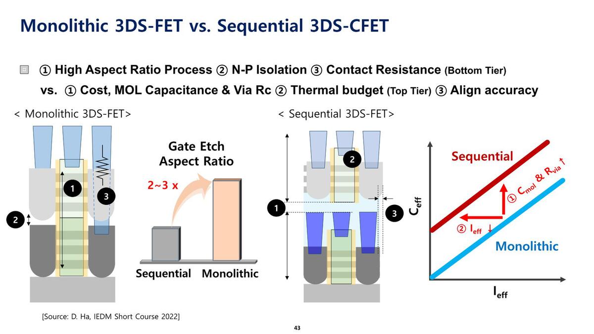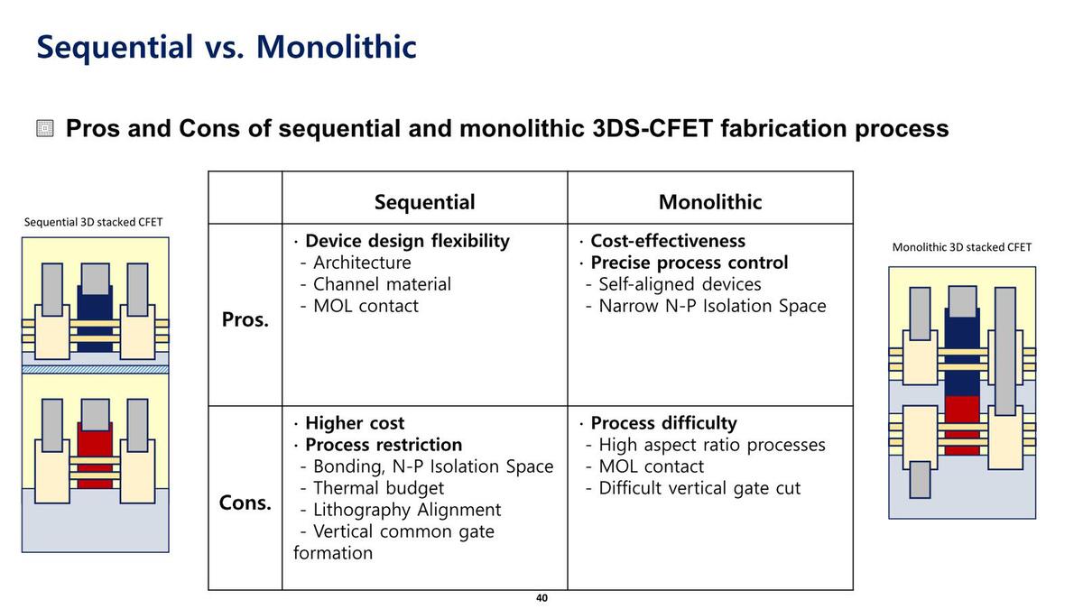 両者の損得を比較したのが下の画像だ。モノリシックは縦穴の構築の際のアスペクト比がシーケンシャルの2~3倍になるのと、PMOS/NMOSの絶縁の問題、それとPMOS側の接触抵抗が問題になる一方、シーケンシャルではコスト以外にMOLの寄生容量や接触抵抗、PMOS側の発熱の問題、それと位置合わせの精度が問題になるとする。