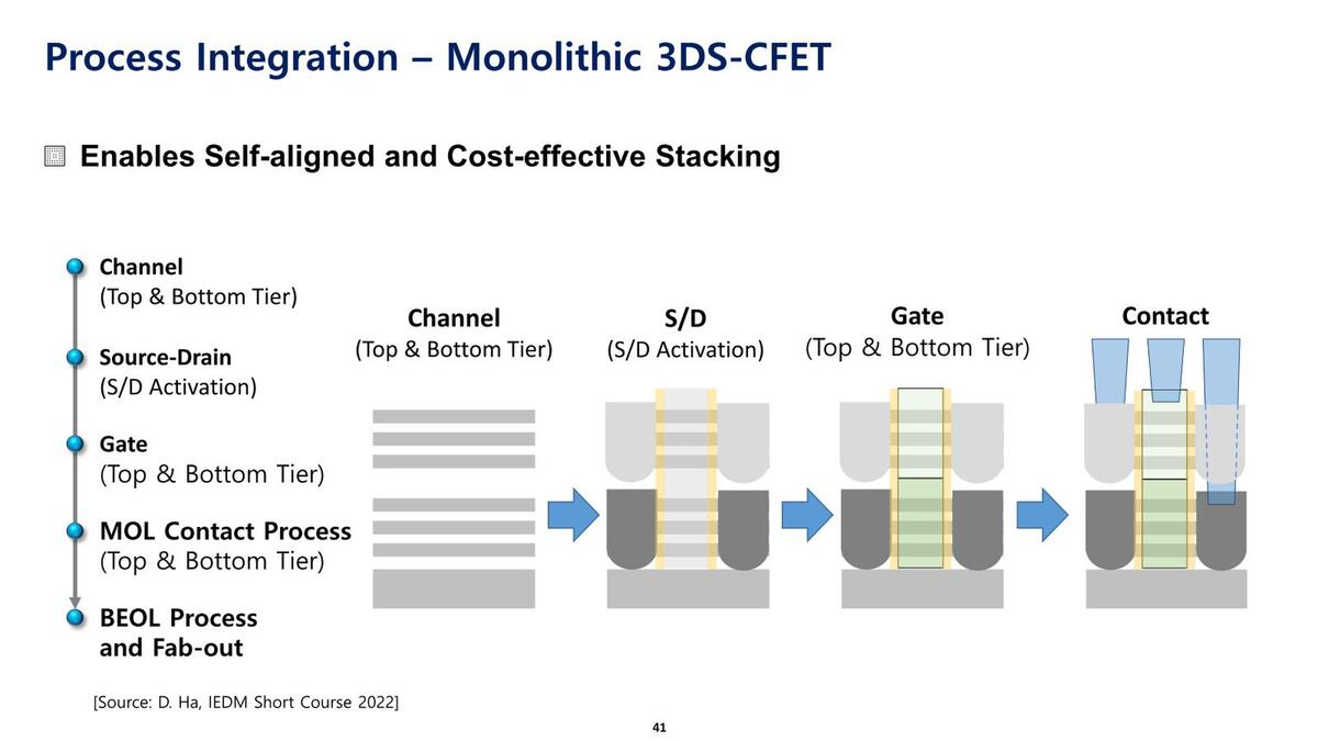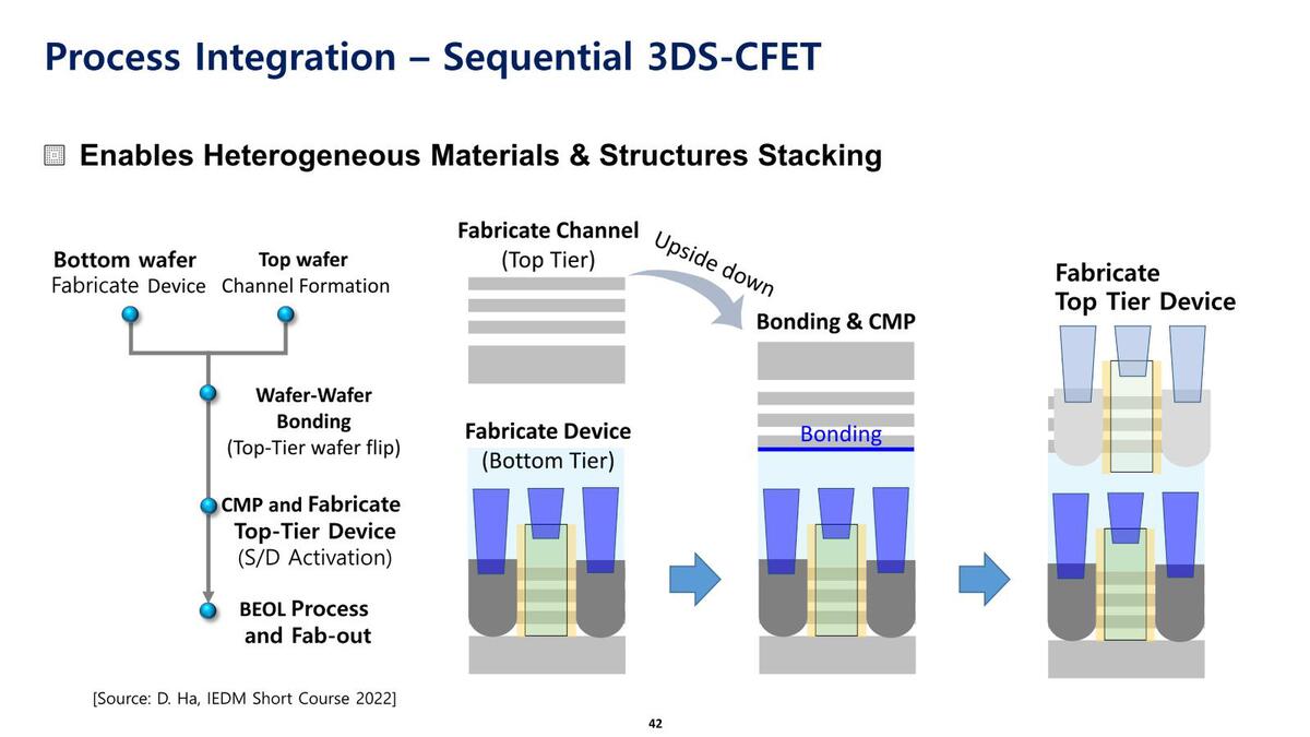 ここでFETがどちらもMBCFETであることは議論にはならないだろう。問題は、シーケンシャルかモノリシックかだ。シーケンシャルとはNMOSとPMOSを別々のウェハーで作成し、これをつなげるもの。モノリシックは、PMOSを作成し、間の配線層を作り、その上にNMOSを作り、という形で一体的に構築する方法である。