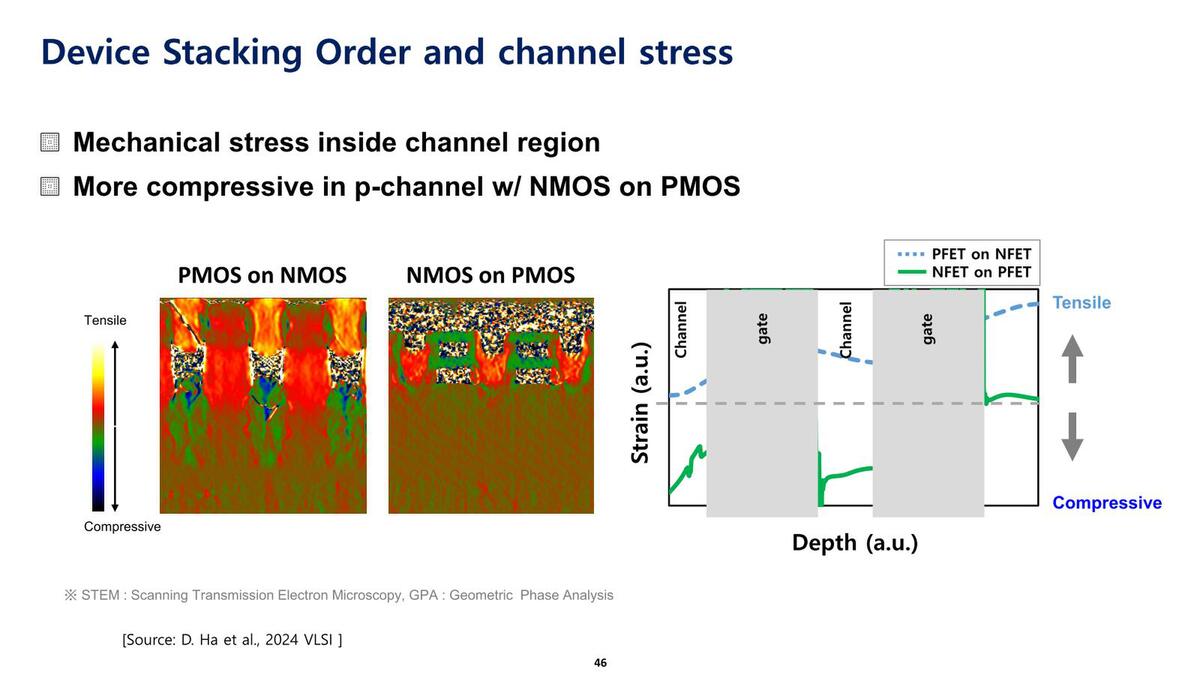 黄~赤が引っ張り応力(Tensile stress)、黒~青が圧縮応力(Compressive stress)をそれぞれ示す。PMOS on NMOS構造では、境界層における引っ張り応力がものすごく大きくなりがちになる