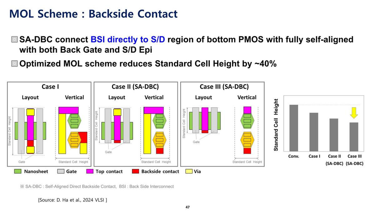 Case IIIは一番実装密度を上げられるのは当然だが、ではTop ContactにどうやってBSからの配線をつなげるつもりなのかという問題が別途生じる。実装の容易さはCase Iが一番容易であり、そこからCase II/IIIと進むごとに難易度が上がり、一方Cell Heightは減るわけで、これもバーターである。どのあたりが着地点として妥当かを判断するのは難しい。