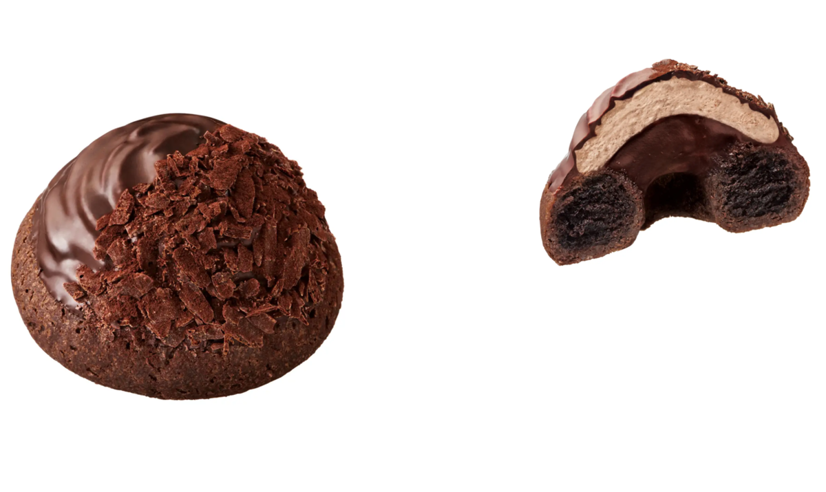 トリュフショコラをイメージしたなめらかな食感のショコラドーナツ生地にガナッシュクリームとガナッシュホイップを重ね、チョコレートをコーティング。フレークチョコとココアパウダーをトッピングして仕上げている。