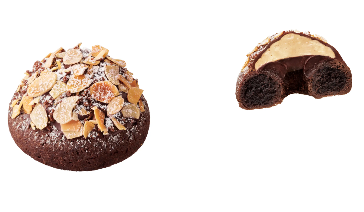 トリュフショコラをイメージしたなめらかな食感のショコラドーナツ生地にガナッシュクリームとプラリネホイップを重ね、チョコレートをコーティング。ローストアーモンドとチョコクランチをトッピングして仕上げている。
