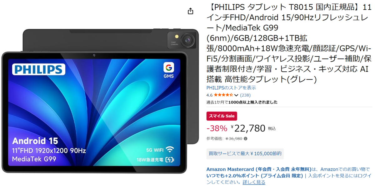 「PHILIPSタブレット T8015」の参考価格は36,980円ですが、セールでは38%オフの22,780円という割引価格で手に入ります。