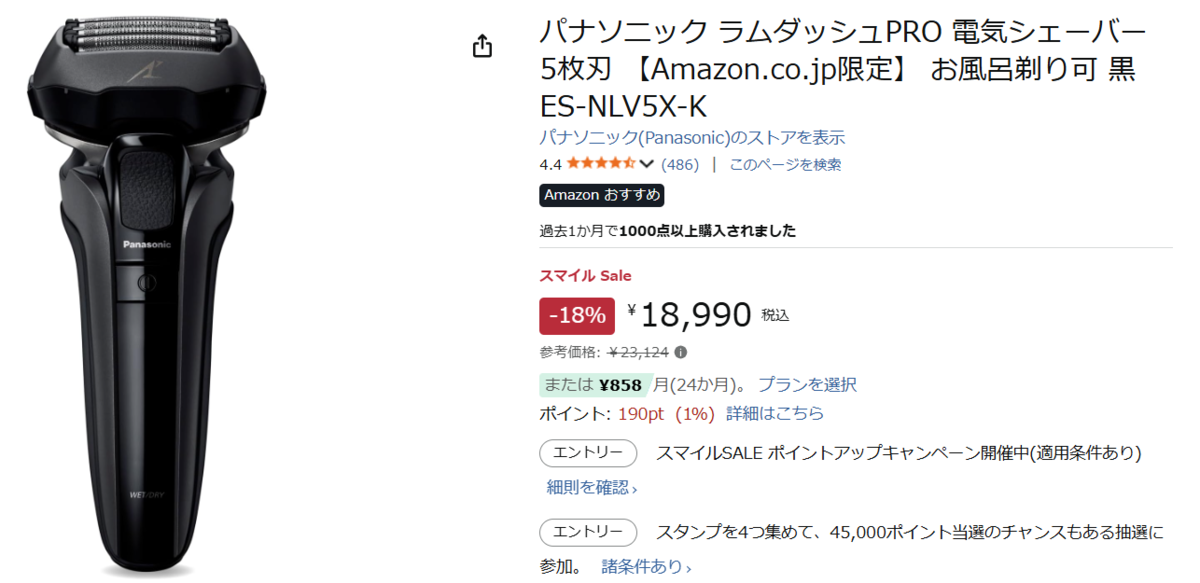 パナソニックの5枚刃シェーバー「ラムダッシュPRO ES-NLV5X-K」が、Amazonスマイル Sale 初売りに登場しました。参考価格23,124円のところ、18%オフの18,990円で販売中です。