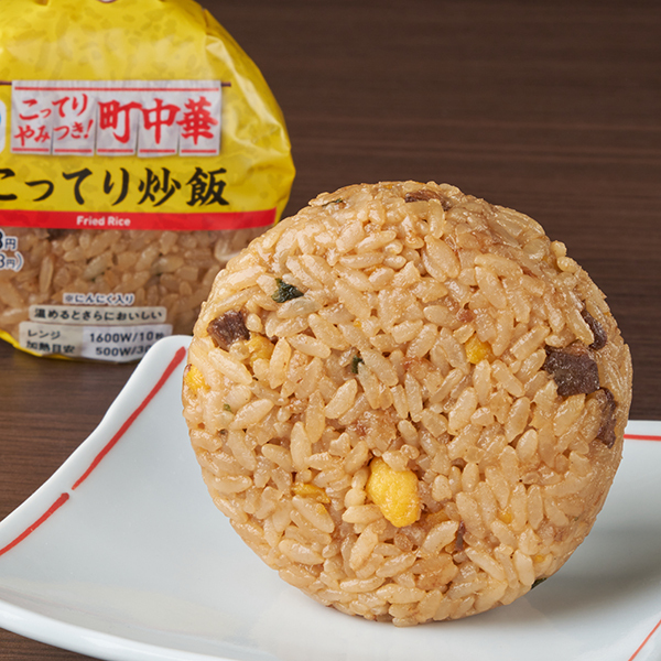 鶏白湯スープ、背脂、醤油、にんにくで、こってりとした味わいに仕上げた、炒飯おむすび。鶏白湯の旨味と背脂のコクが、また食べたくなる味わいだという。