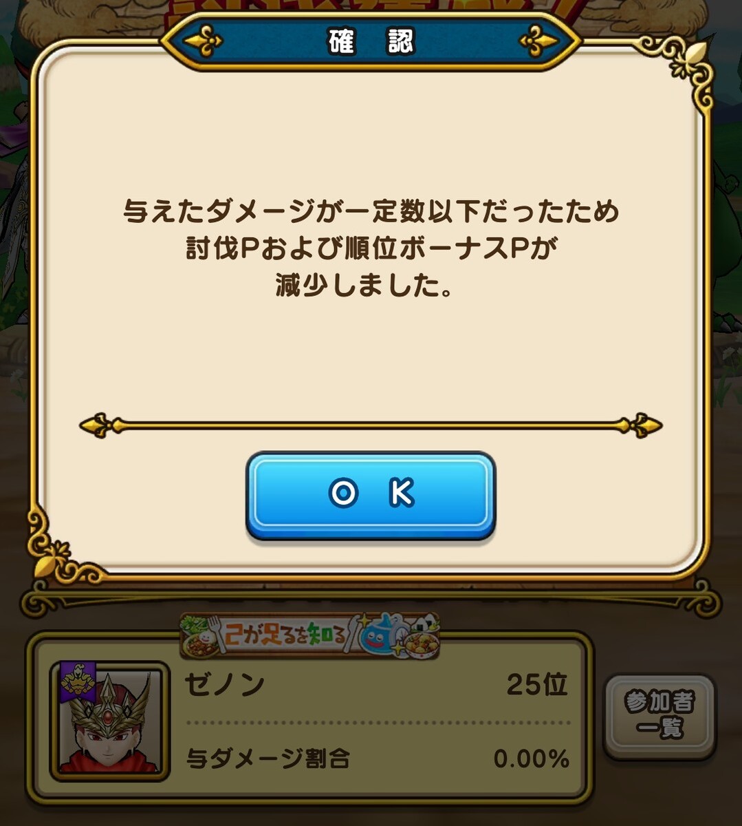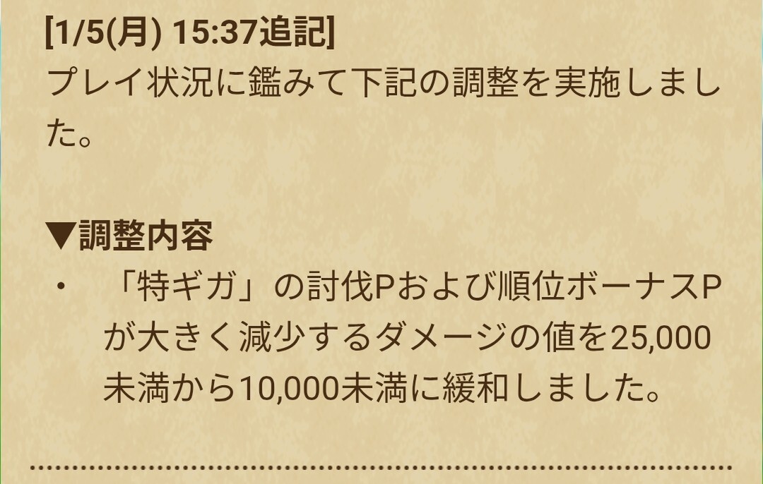 緩和されたのはボスに一定量のダメージを与えなかったプレイヤーに対する「ペナルティ」のハードル。本来25000以上ダメージを与えないと【ポイントが大きく減少する】ところ、本ボスにおいては10000以上でOKになる。