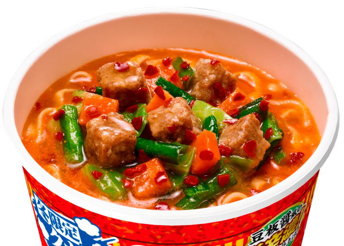「カップヌードル 辛味噌」は新発売。コクのある3種の味噌をベースに、肉と野菜の旨みを加え、豆板醤(トウバンジャン)の風味と唐辛子の辛みをきかせた、"旨辛"で濃厚なスープが特長。後引く辛さがクセになる一杯に仕上げている。具材には謎肉、キャベツ、ニンジン、ニラ、赤唐辛子を使用。