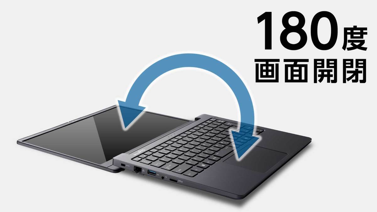 キーボードにはフルサイズのカーソルキーを採用し、ディスプレイの開閉に連動してキーボード面が持ち上がるリフトアップヒンジ構造を採用。これにより、タイピング時に自然な傾斜が生まれ、長時間作業時の快適性に配慮した設計としている。ディスプレイは最大180度まで開くことができ、対面での画面共有やプレゼンテーションなどにも対応する。